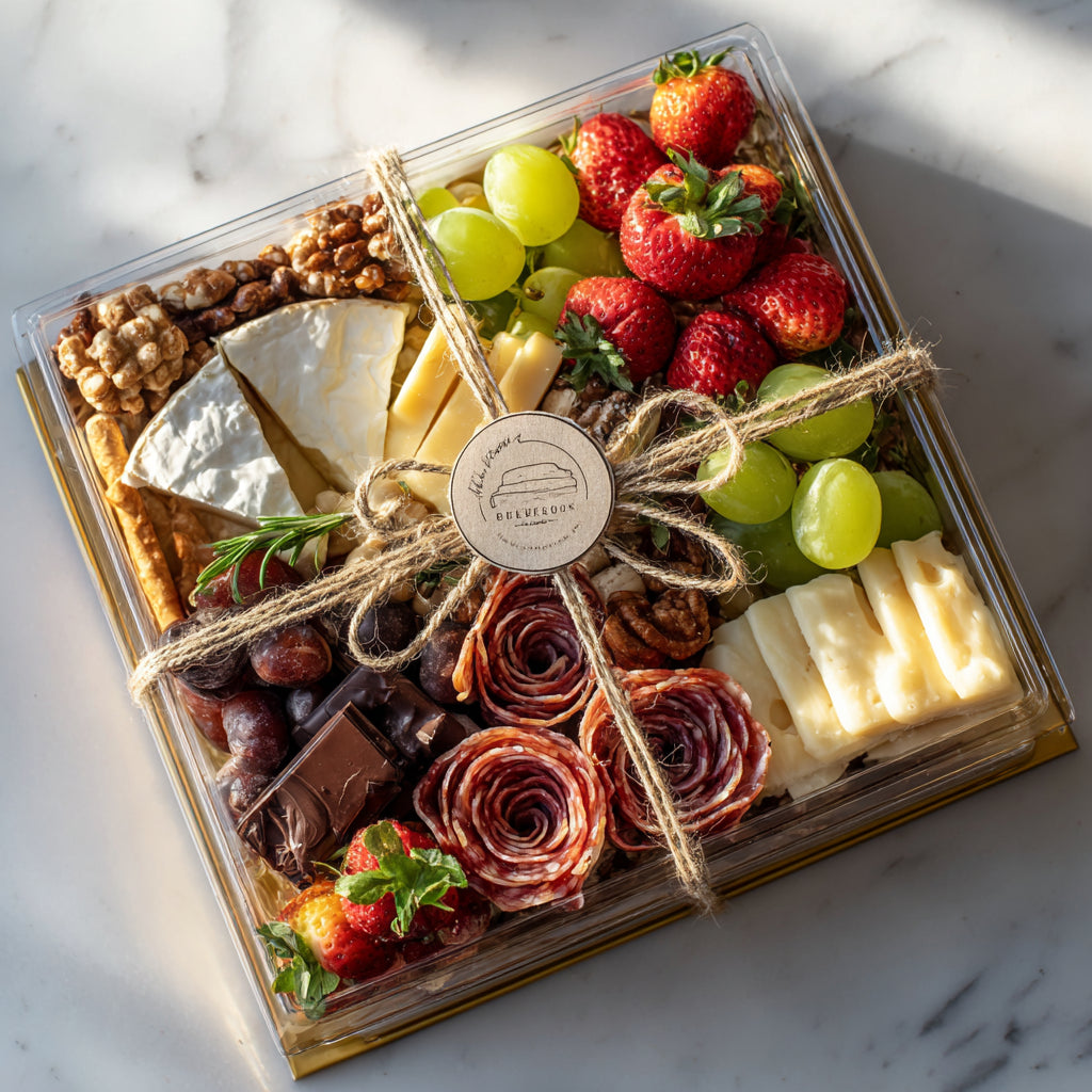 Each charcuterie board includes a thoughtfully curated selection of premium cheeses and cured meats, paired with seasonal fresh fruit, artisan crackers or breadsticks, and elevated accompaniments. Designed for both presentation and ease, every order is served in a secure, reusable cup to ensure effortless enjoyment and refined display.